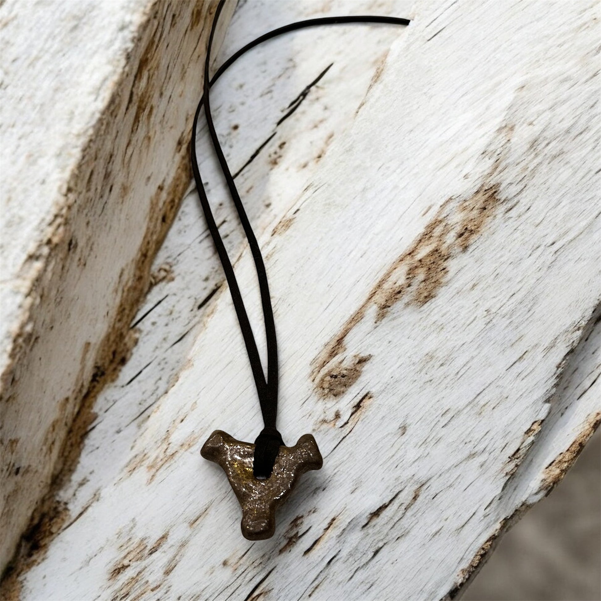 Ceramic piece with a suede cord.
